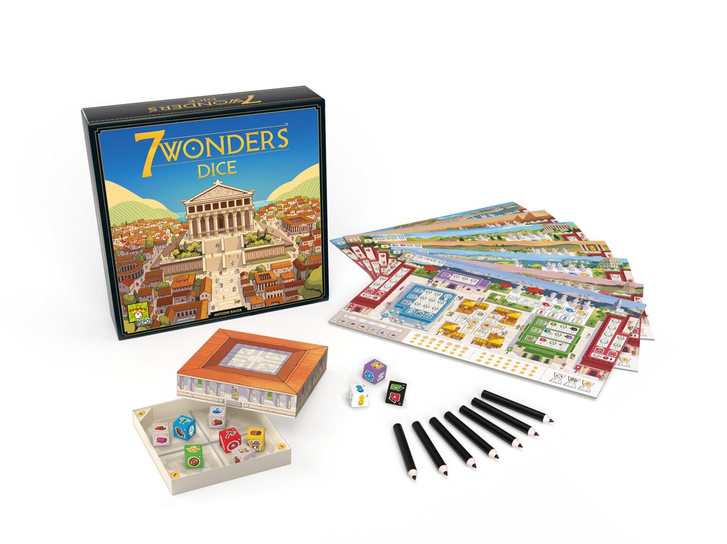 Stýrið einni af sjö stærstu borgum fornaldar til velsældar í 7 Wonders Dice. Í spilinu byggið þið undur sem munu standast tímans tönn, fleyta vísindum áfram, þróa viðskipti, stýra auðlindum, og halda utan um gullforðann — og hafa vökult auga yfir nágrannaborgunum, því þið munuð gjalda fyrir að leiða þær hjá ykkur.