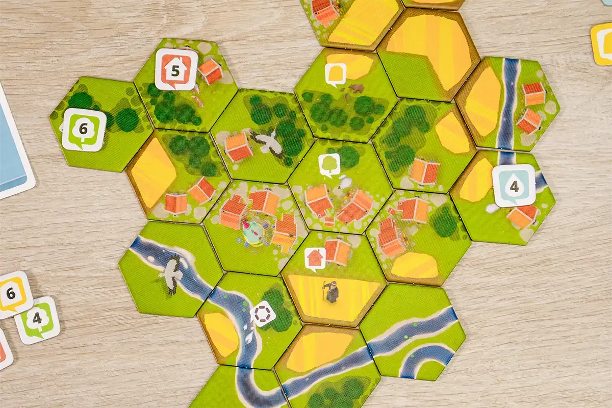 Dorfromantik: Light Luggage er samvinnu- og flísalagningaspil þar sem þið vinnið saman að því að skapa fallegan heim úr sexhyrndu landslagi, og fáið eins mörg stig og þið getið.