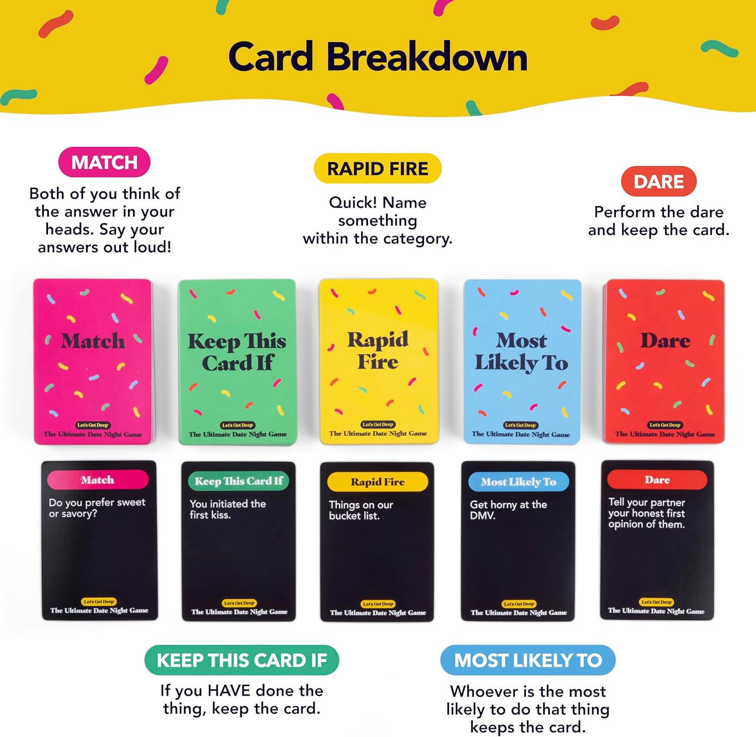 Let’s Get Deep: The Ultimate Date Night Game er nákvæmlega það sem stendur á pakkanum. Allt sem þú þarft til að halda fullkomið stefnumótakvöld með makanum. Fullur kassi af skemmtun, rómantískum hlutum að gera, og litlum leikjum. Frábær gjöf fyrir pör sem vilja eiga eftirminnilegt kvöld saman. Kertaljós ekki innifalið.