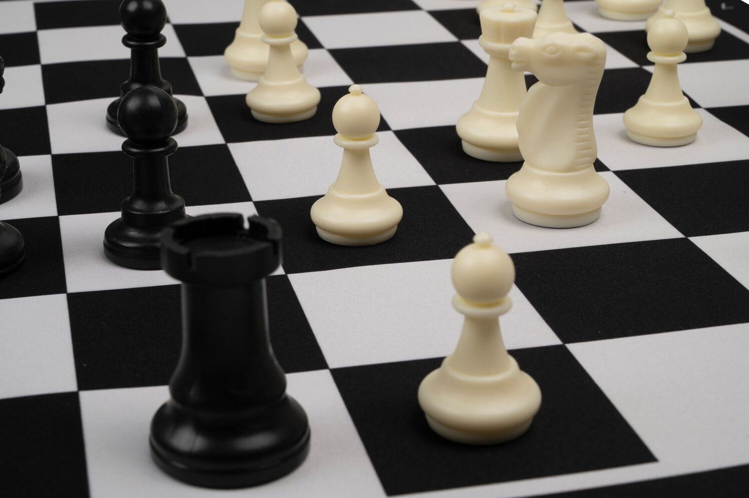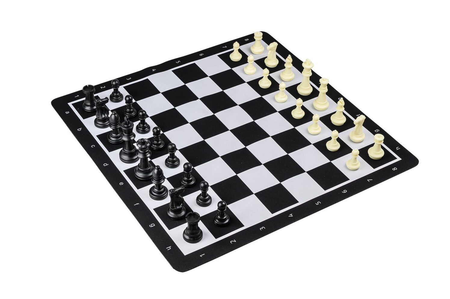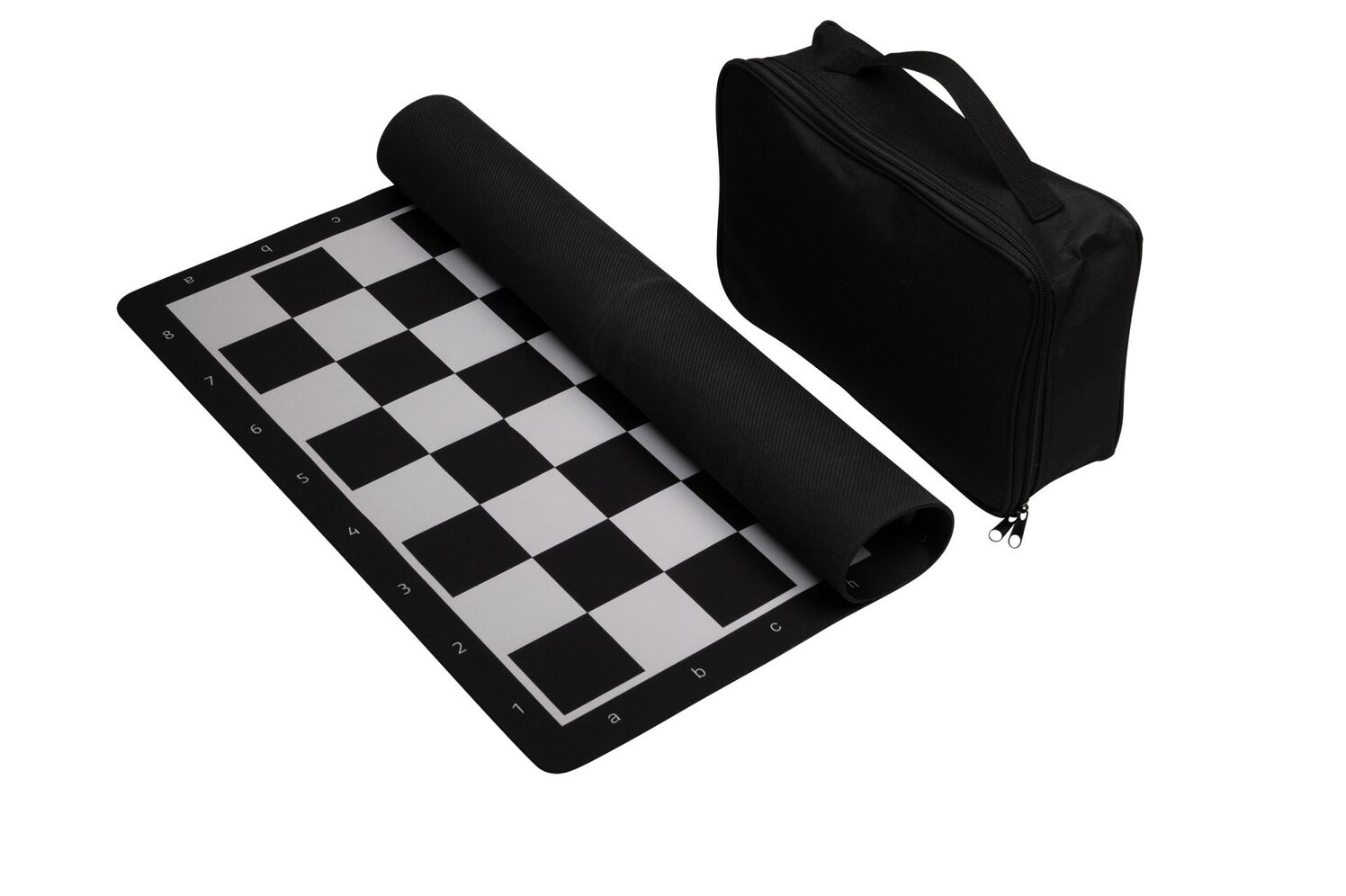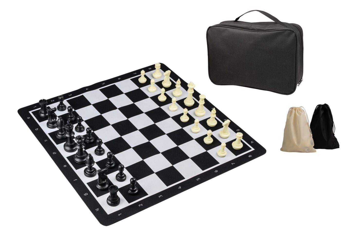 Skáksett með tösku, pokum undir mennina, þyngdum plastmönnum og upprúllanlegu skákborði.