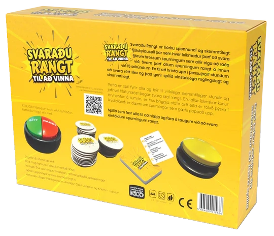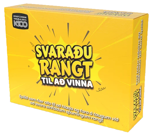 Svaraðu Rangt er hörkuspennandi og skemmtilegt fjölskylduspil þar sem þið þurfið að svara fjórum hressum spurningum sem allir eiga að ráða við.
