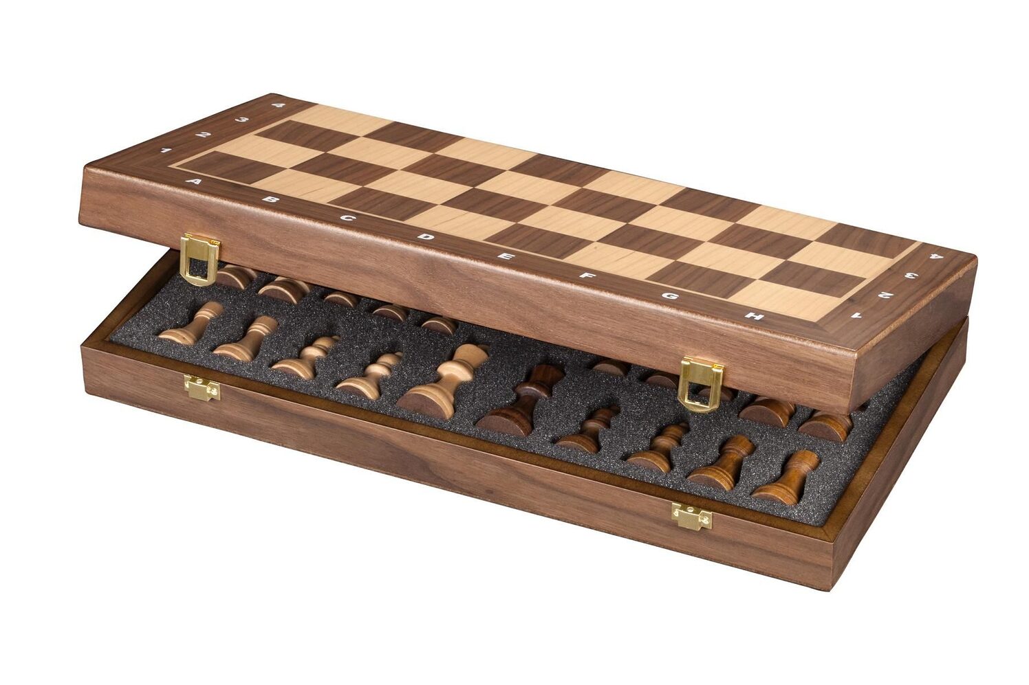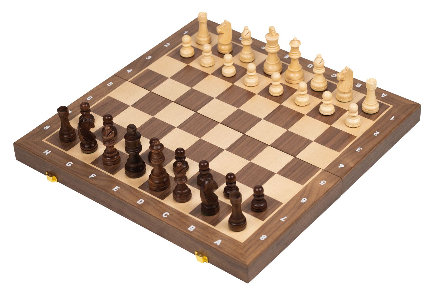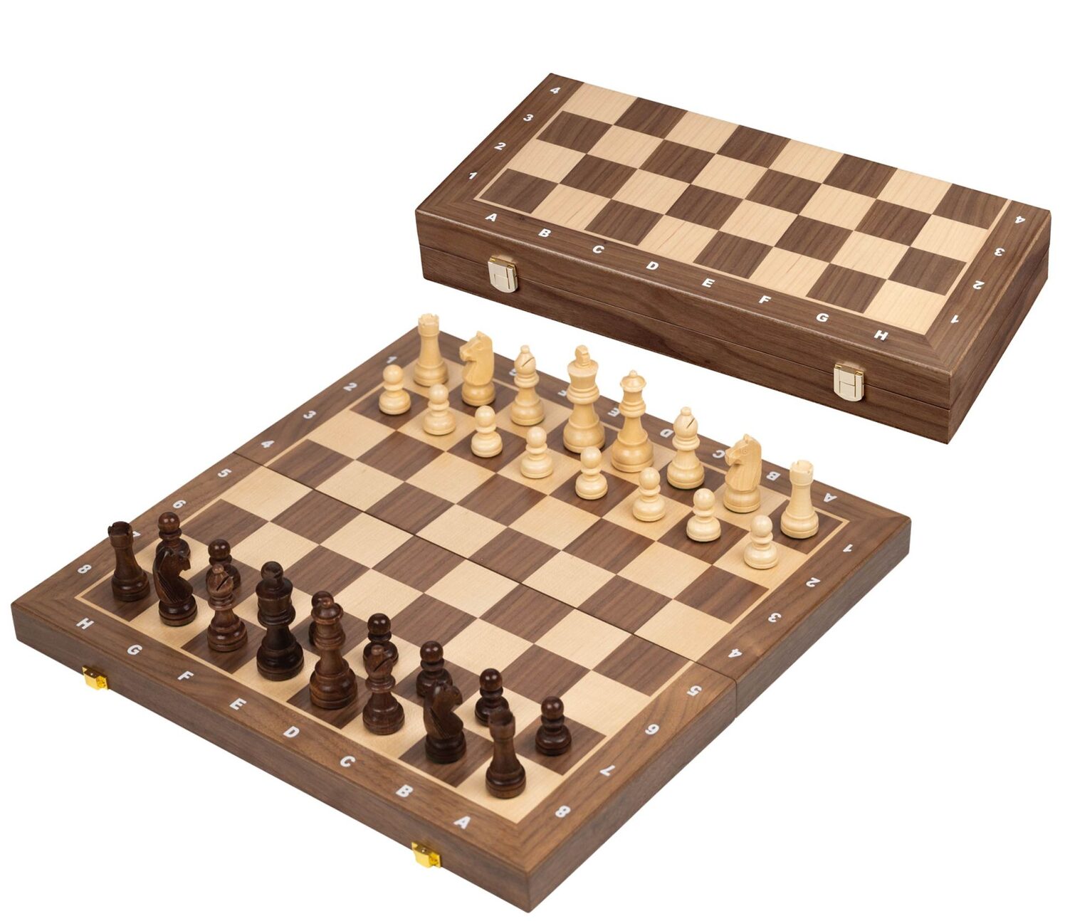 Taflsett (eða skáksett, ef þú vilt) með þyngdum taflmönnum úr schima-viði með filtbotni. Borðið er askja með geymslu fyrir leikmenn og er úr hlyn og hnotu.