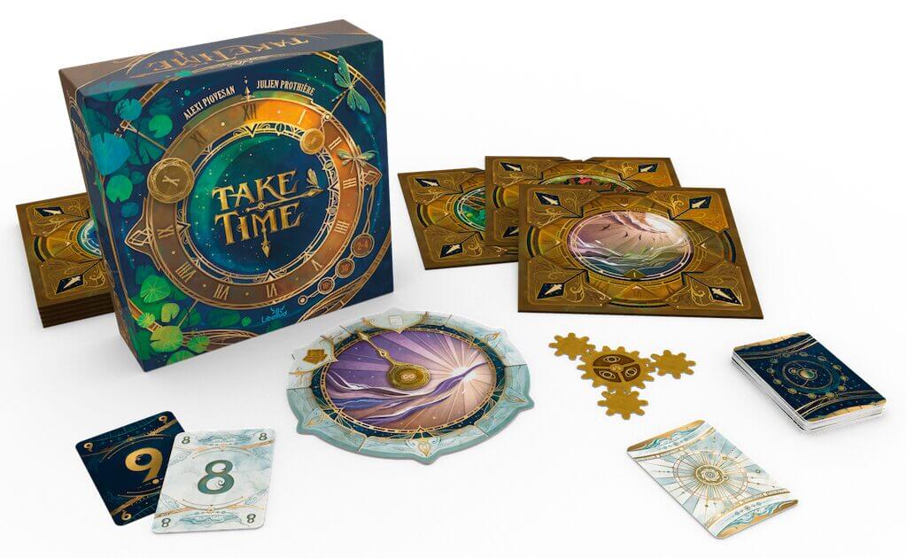 Take Time er aðgengilegt og skemmtilegt samvinnuspil þar sem þið skiptist á að leggja niður tólf spil, eitt spil í einu, í kringum klukku með sérstökum reglum fyrir hvert próf. Í spilinu eru 40 klukkur — próf sem þið spilið í gegnum.