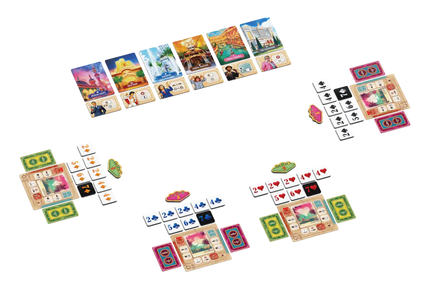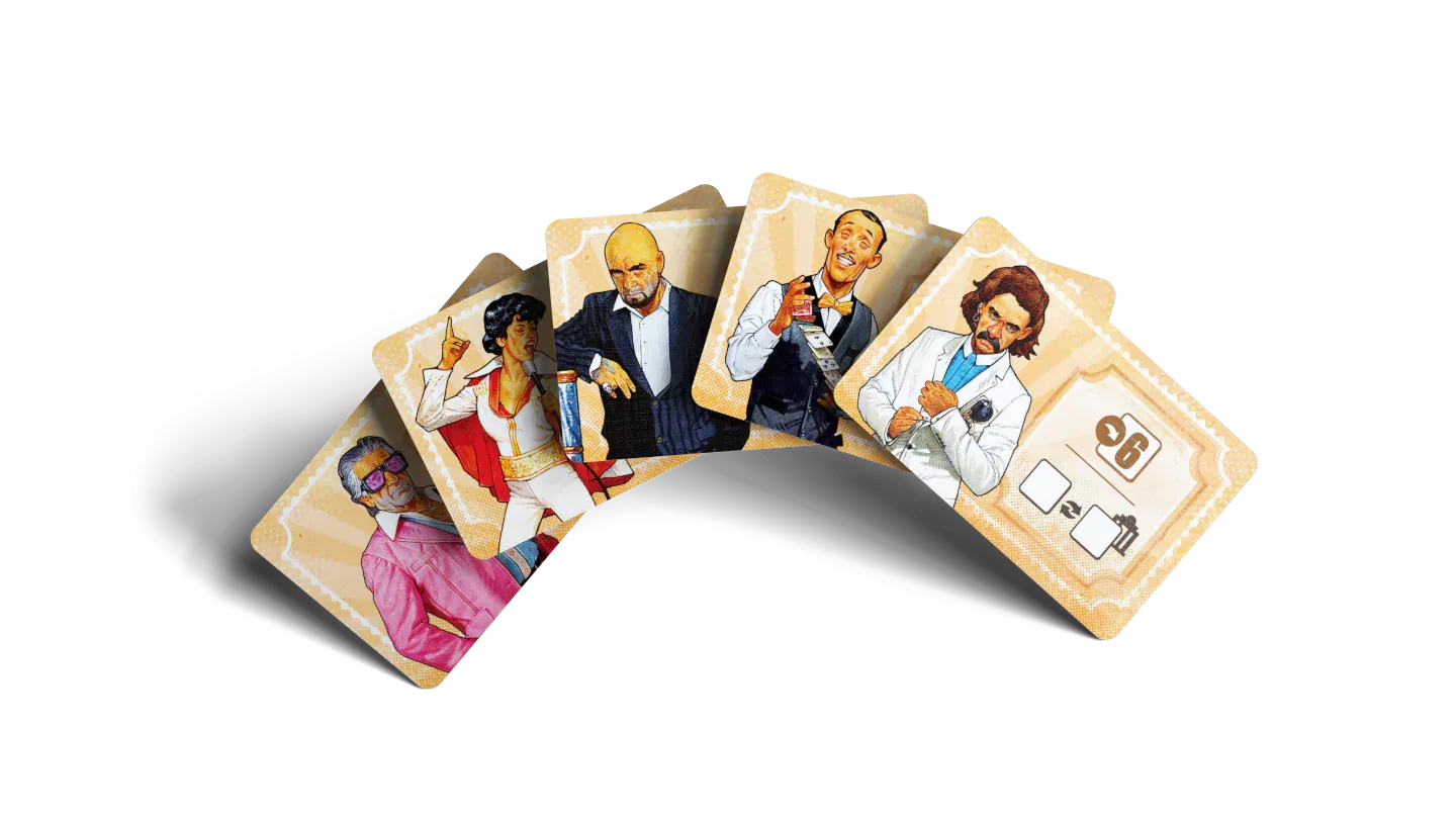 Vegas Strip er blekkingarspil þar sem þið lumið á upplýsingum um hvaða spilavíti eru spillt. Skiptist á að spila út veðmálsflísum (tveir tvistar, tveir fjarkar, ein fimma, ein sexa og ein sjöa) á eitt af spilavítunum.