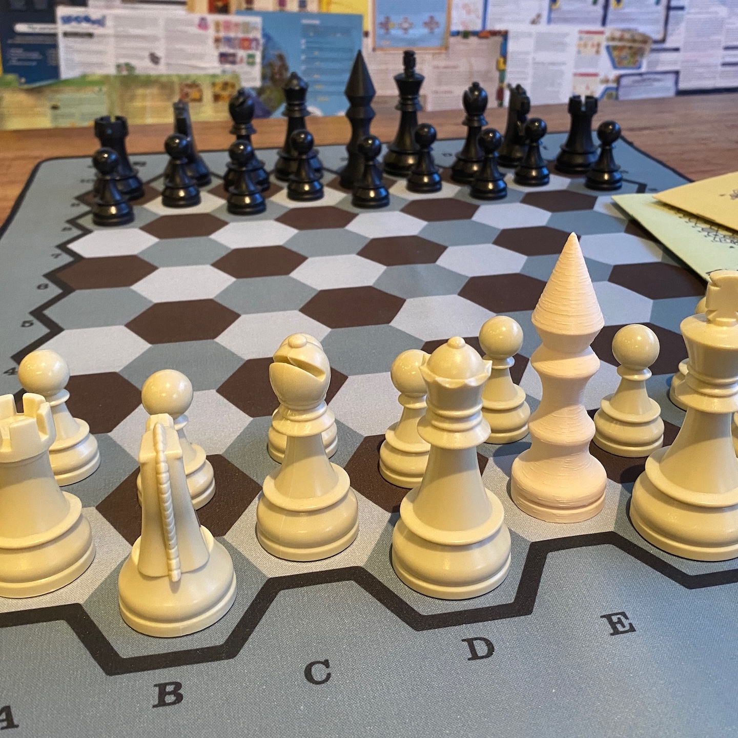 Hvort lið samanstendur af 9 mönnum og 9 peðum. Hvort lið hefur sinn lit. Nöfn taflmanna eru hin sömu og í hinni klassísku skák, og níundi maðurinn heitir Víkingur.