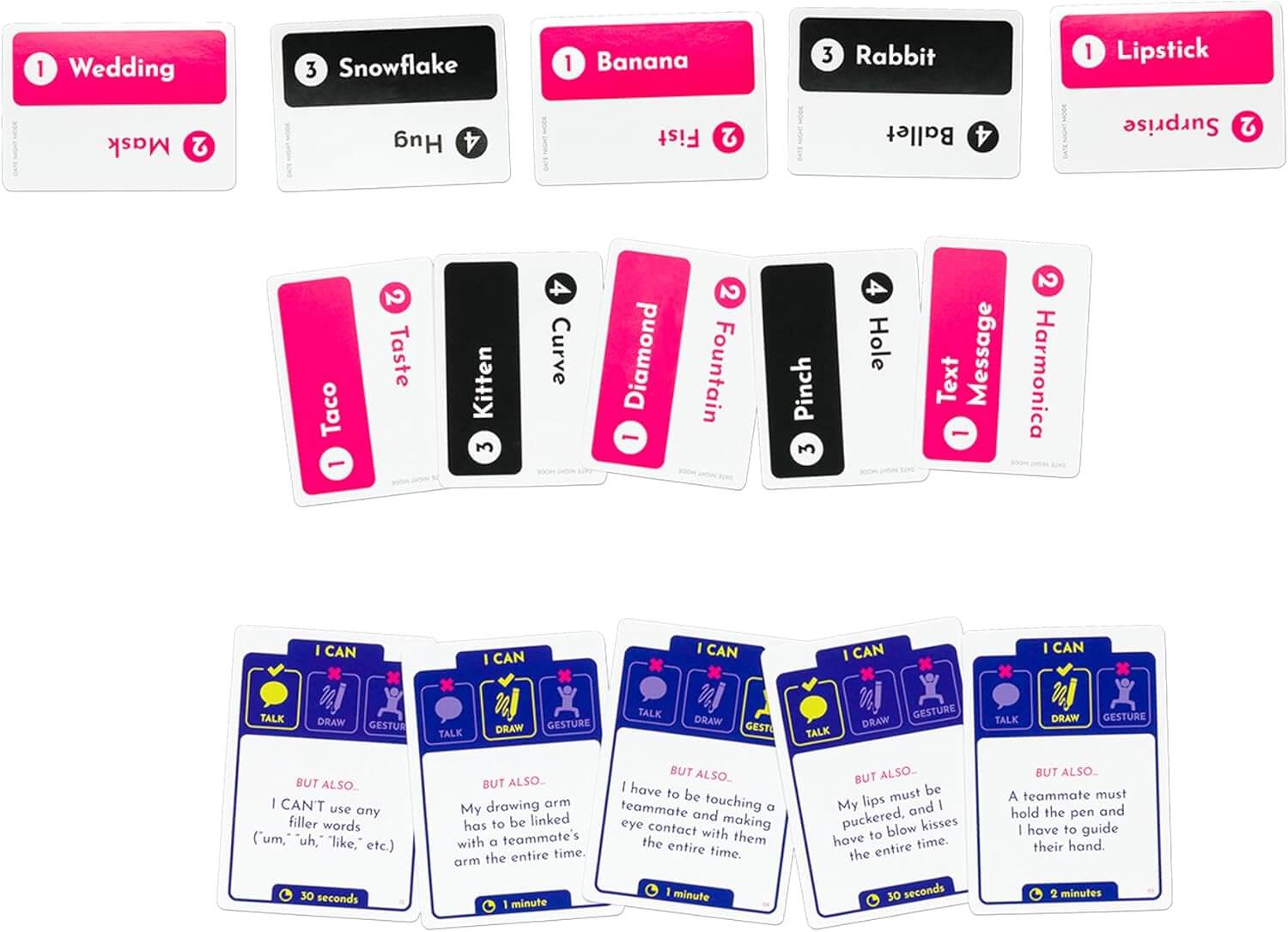 Spil sem tekur ykkur úr þægindarammanum og kemur ykkur í kjánaskap. Fullkomið í partí og hópefli. Merkilegast er að það er líka hægt að spila sérstaka tveggja-manna stefnumóta-útgáfu þegar þið viljið flippa út með makanum.